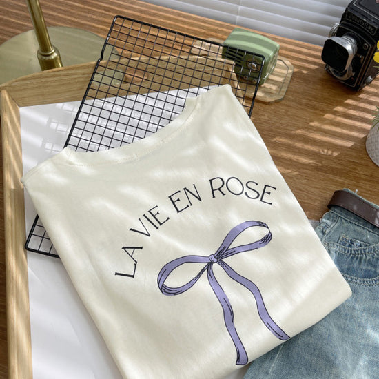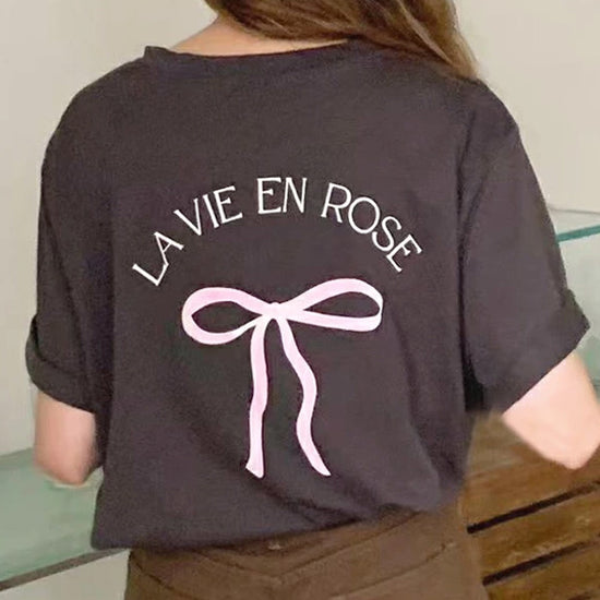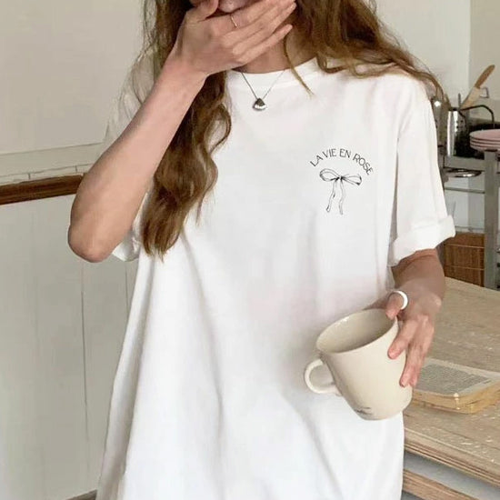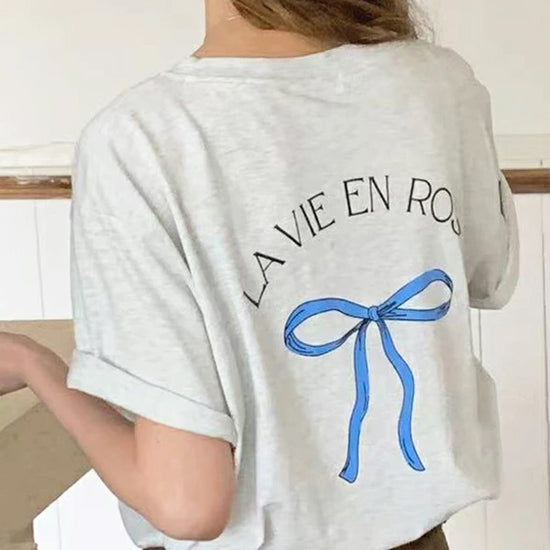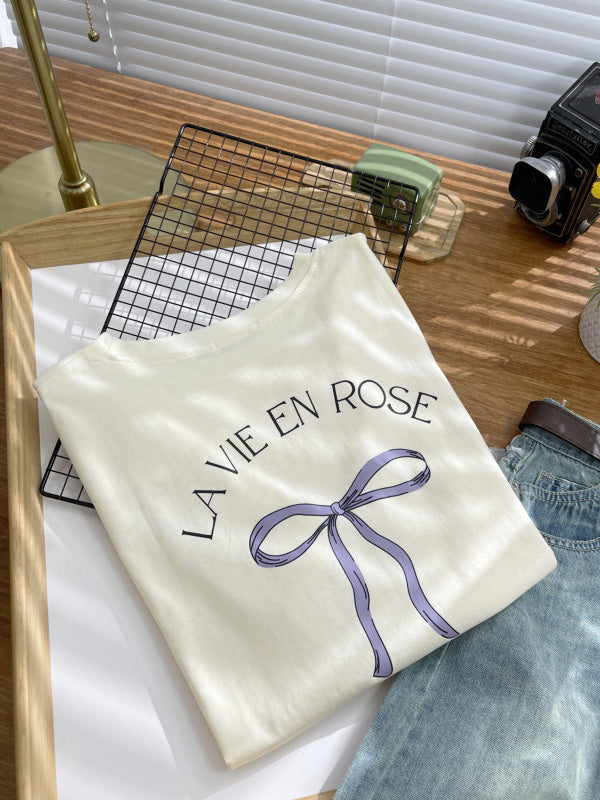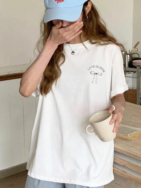 【225】Tシャツ リボン ロゴ 半袖 綿 通販 韓国 服 夏 トップス レディース かわいい 安い カジュアル シンプル トラベル 韓国 ファッションバックリボンロゴTシャツ