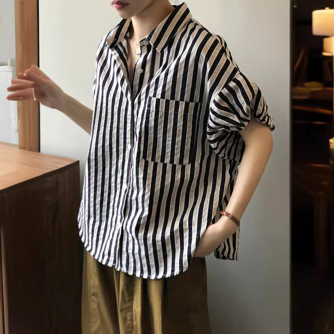 ID792 2色展開 ストライプ柄 シャツ レディース 五分袖 バルーンスリーブ ゆったり ショート丈 高見え トップス 夏 カジュアル