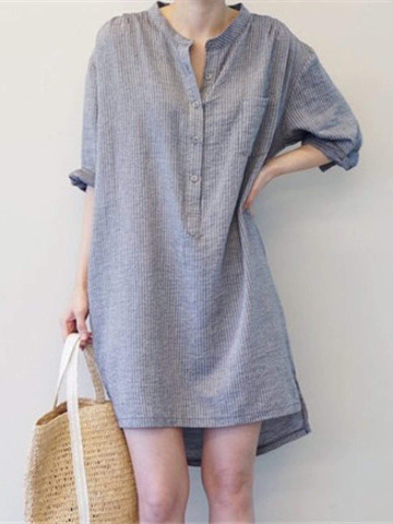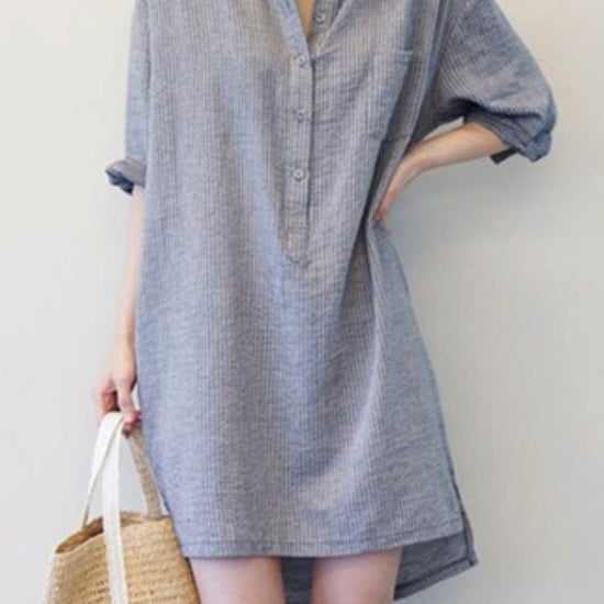 ID814 ストライプ柄 コットンリネン シャツワンピース レディース 五分袖 前後差 ゆったり ミドル丈 サイドスリット 夏 涼しい カジュアル